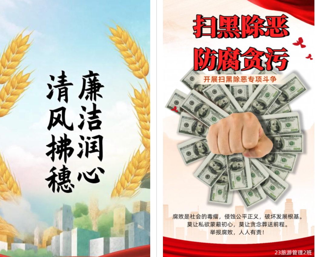 “廉韵流芳”主题海报设计大赛:大一、大二年级团支部自发征集班内廉洁主题创意海报,聚焦“崇廉尚洁”“清风校园”等核心元素,鼓励学生勇于创新,敢于创意。