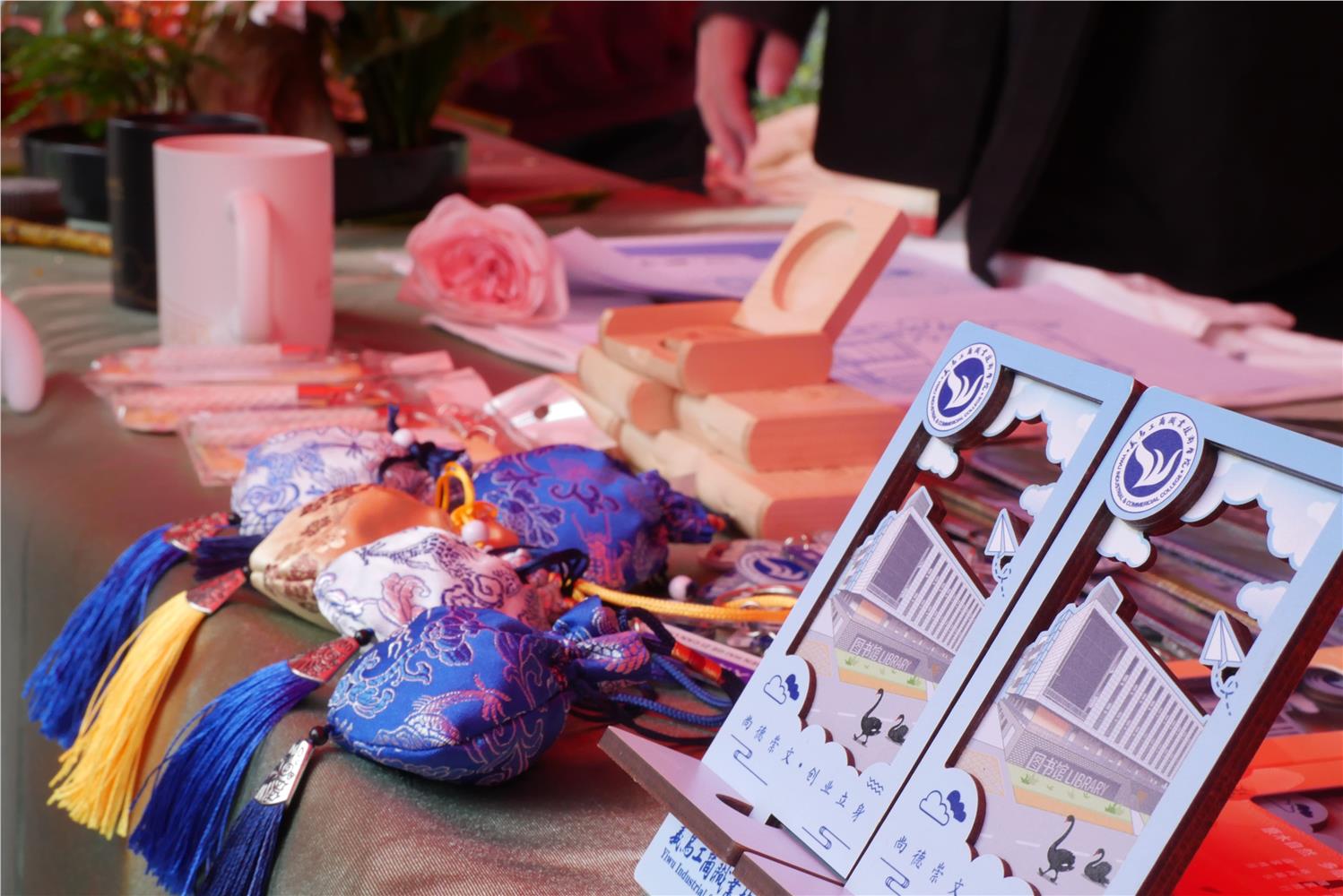 展区另一侧,非遗缠花、点翠(使用染色的玉米叶替代翠鸟羽毛)工艺作品与优秀策划案展示区同样吸引人。学生们将非遗技艺与现代设计理念结合,创作出兼具传统韵味与时尚感的缠花发饰、点翠发簪等优秀作品。博观微创工作室带来原创的精美文创产品,展位前人气火爆,产品销售一空。