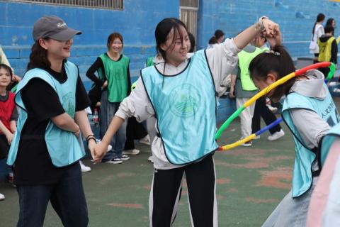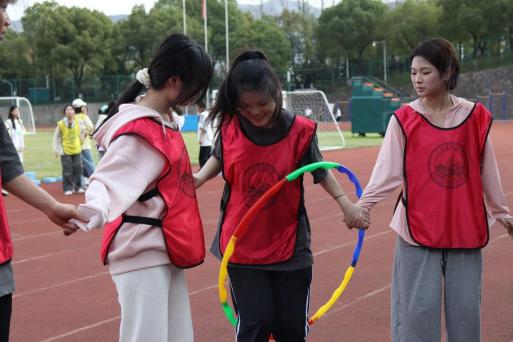 小小的呼啦圈,联动着整个团队,队友们互相配合,让小圈套中下一位队友。时间流逝着,他们配合默契,在一片欢声笑语中完成了比赛,团队里也产生了不可言说的默契感。