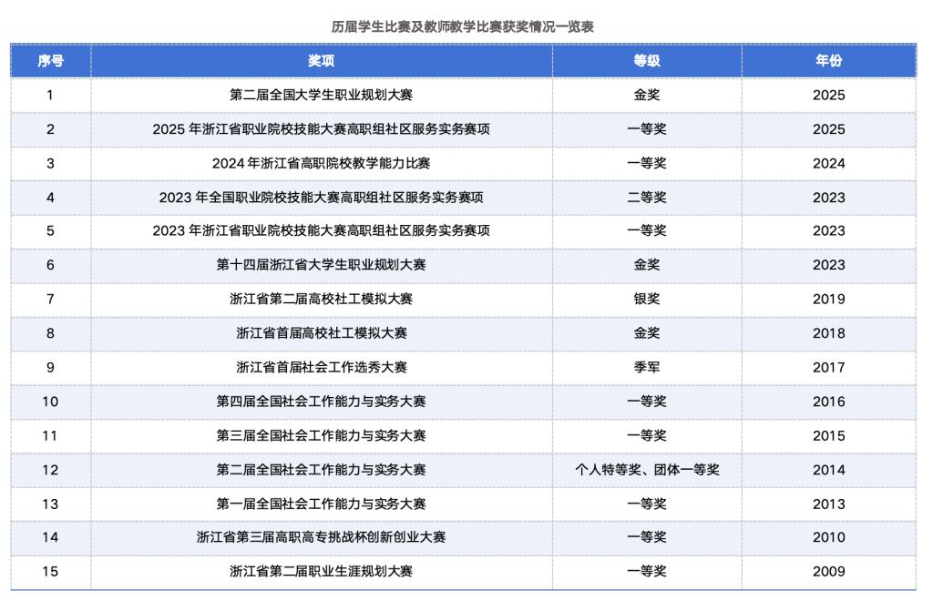 陈璟熠,2025届毕业生,专升本在读,在校期间获2025年第二届全国大学生职业规划大赛金奖、2024年浙江省第十五届大学生职业规划大赛金奖、2023年全国职业院校技能大赛“社区服务实务”赛项二等奖、2023年浙江省职业院校技能大赛“社区服务实务”赛项一等奖、国家奖学金、省政府奖学金、澳门大学对外交流特等奖学金、楼仲平奖学金等。
